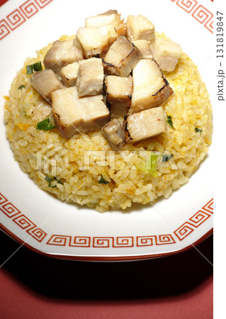 角切りチャーシュー乗せ玉子チャーハンを白背景で撮影