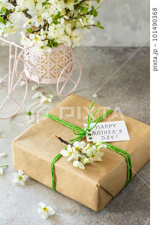 Mother's day or womens day background. Blooming cherry branch and a present with a congratulatory inscription that Happy Mother's Day on a gray stone table. Copy space.