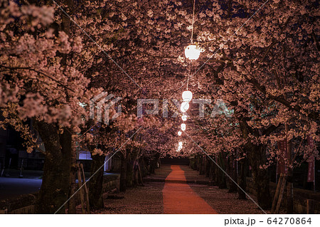 菊池神社の参道に赤い絨毯と夜桜と祭りの提灯が浮かび上がる風景