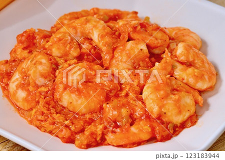 中華料理のエビチリ、えびチリ、海老チリ。海老のチリソース炒め。海鮮料理。