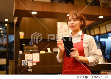 Woman produce clerk holding tablet and standing beside green orange crate in store produce section