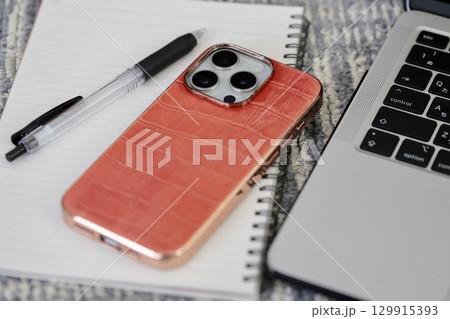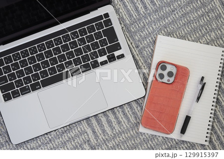 テレワークイメージ ノートパソコンとスマホと筆記用具
