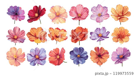 Flowers dew drops cartoon vector set. Petals buds bloom pink purple orange red floral garden freshness botanical beauty variety floral nature isolated on white background