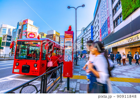 日本の東京都市景観 幸せを運ぶ黄色のイケバスなどを望む。まもなく発車…=12日、池袋駅東口