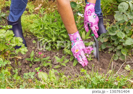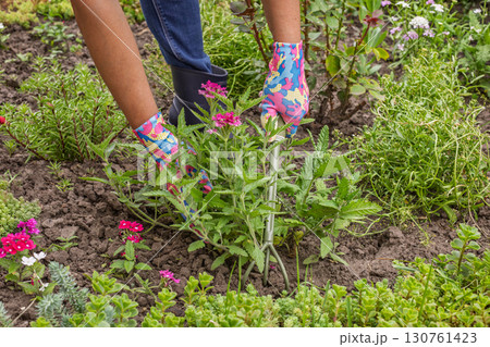 Gardener is planting vervain in a ground on the garden bed.