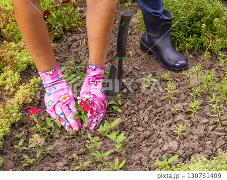 Gardener is planting verbena in the ground on the garden bed.