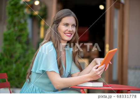 Romantic female in blue dress sitting in open air cafe, holding orange tablet, smiling
