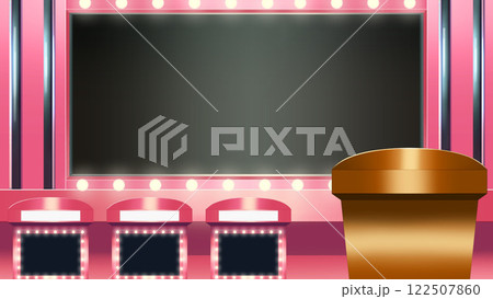 Illustration of a two-story market building with awnings and streetlights on a black background.
