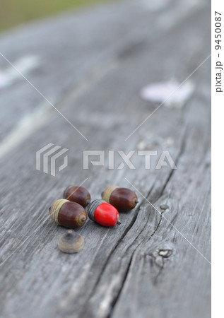 赤い落ち葉とどんぐりと秋背景、カラフルな紅葉と秋の素材