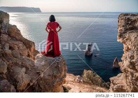 woman red dress stands on a cliff overlooking the ocean. The scene is serene and peaceful, with the woman's dress flowing in the wind. The ocean is calm and blue.