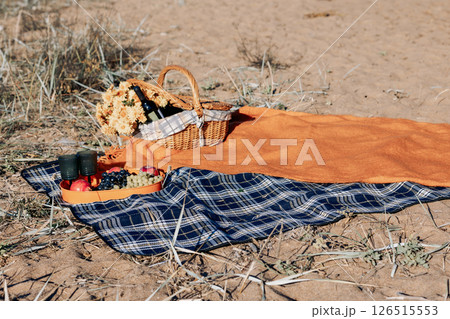 Autumn picnic on beach by sea. Fresh fruits, wine glasses, bottle, grapes, pomegranate near picnic basket on orange blanket. High quality photo