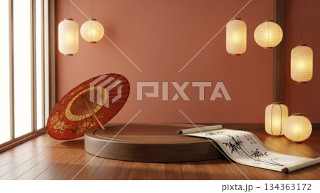 Chinese Podium with Paper Umbrella, Red Lantern, and Brush Painting