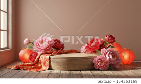 Chinese Podium with Peony Flowers, Silk Fabric, and Red Lantern