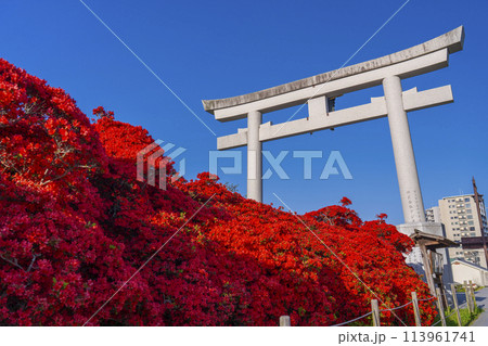 長岡天満宮 満開の霧島つつじと正面大鳥居