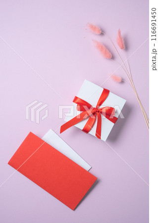 Flat lay of celebration. red envelope, white gift box and pink flowers on a pastel pink background.