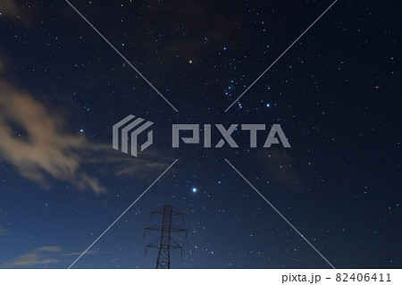 北杜市武川町、送電線の上に冬の大三角とオリオン座(水車公園から)
