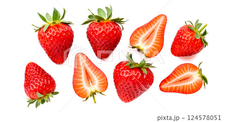 collection of strawberries on white backdrop, displaying variations from whole to sliced. Vivid red hue and detailed texture make each piece stand out distinctly
