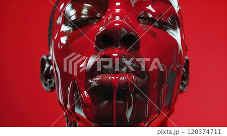 A close-up of a person's face, covered in thick, glossy red liquid, creating a striking and surreal visual contrast with the vibrant red background.