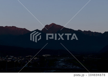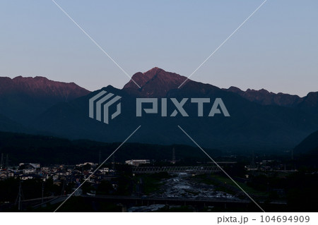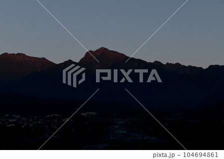 北杜市武川町、明け行く南アルプス甲斐駒ケ岳、未だ眠る麓の街並み