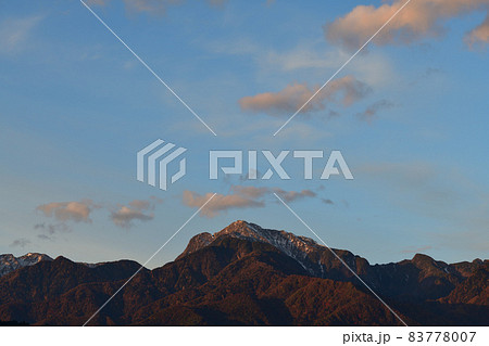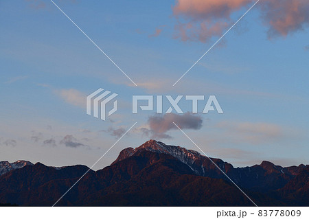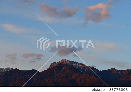 北杜市白州町、朝日が照らす甲斐駒と周辺の山々