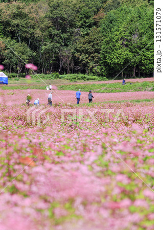 長野県箕輪町の赤そばの里に咲く満開の赤そば畑と見物客の風景