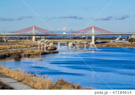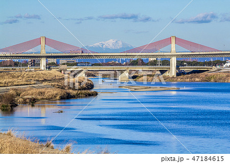 愛知県 庄内川に架かる名古屋高速赤とんぼ橋と御嶽山