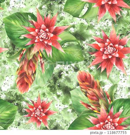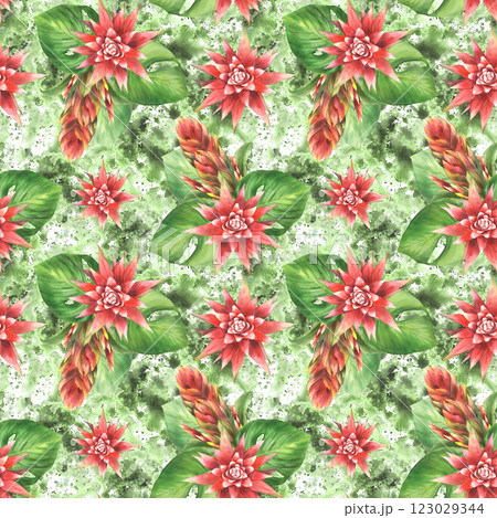 Tropical plant seamless pattern on watercolor stains spotted background. Red bromeliad flower, buds with anthurium leaf, exotic leaves. Hand drawn illustration on isolated white background