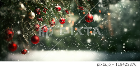 雪降るクリスマスツリーと赤いオーナメントの美しい装飾