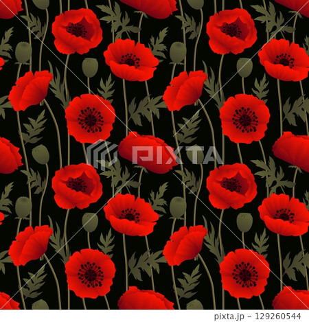 Seamless pattern of red poppy flowers and green leaves on black background botanical floral design with blooming petals buds and foliage perfect for fabric wallpaper or packaging decoration