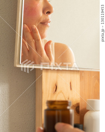 鏡に向かって赤みがかった頬にローションを塗る女性の横顔の下半分が移った鏡