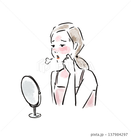 鏡を見ながら肌荒れを気にする女性のシンプルイラスト