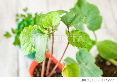 春牡丹の季節のオクラの芽。苗。野菜、家庭菜園、畑イメージ素材