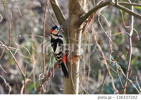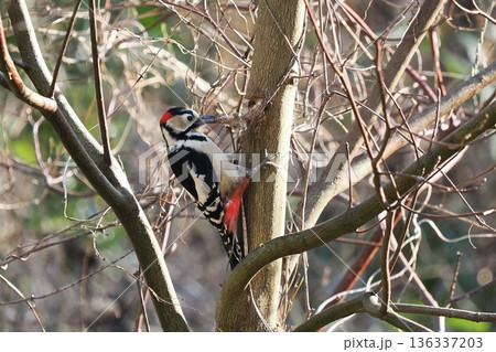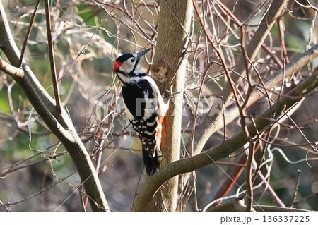 枯れたサクラの木にとまって餌を採ろうとするキツツキ、アカゲラ