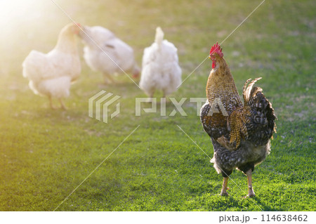 Group of grown healthy white hens and big brown rooster feeding on fresh first green grass outside in spring field on bright sunny day. Chicken farming, healthy meat and eggs production concept.