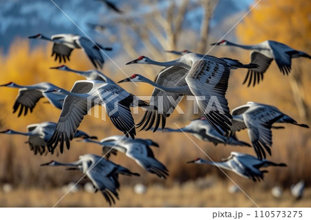 A flock of Sandhill Cranes during their fall migration. AI generative
