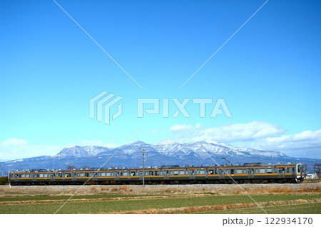 群馬県庁と赤城山、雪の上越線115系電車