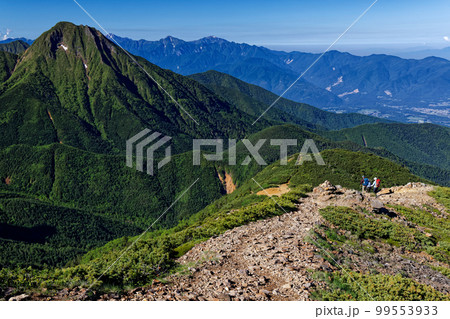 八ヶ岳連峰・硫黄岳稜線から見る赤岩ノ頭の登山者と仙丈ヶ岳