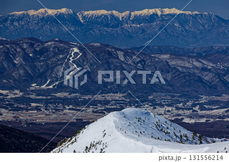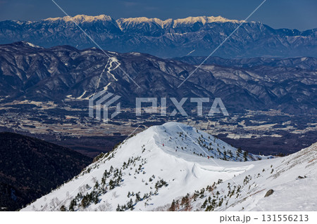 冬の八ヶ岳連峰・硫黄岳から見る赤岩ノ頭の登山者と中央アルプス