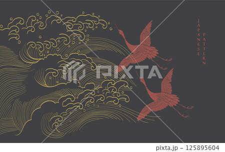 Crane birds and ocean sea and cloud template in oriental style. Hand drawn line. Abstract landscape with Japanese hand drawn wave pattern vector. Nature art background