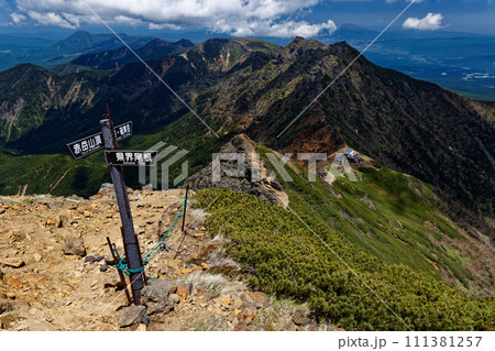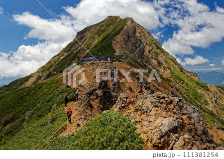 夏の八ヶ岳連峰・赤岳と稜線を行く登山者