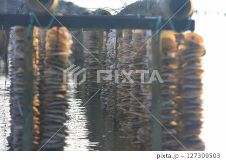 夕日を浴びる牡蠣養殖用のホタテの貝殻