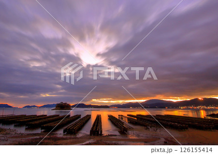 牡蠣抑制棚が並ぶ 冬の瀬戸内夕景