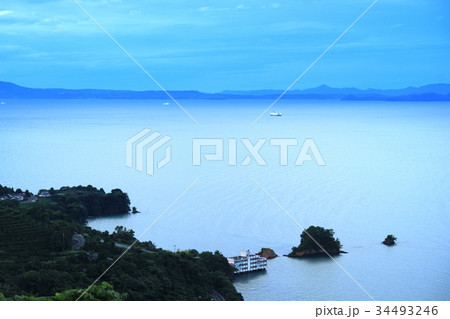 夕暮れの瀬戸内海に浮かび上がる 島々や牡蠣抑制棚