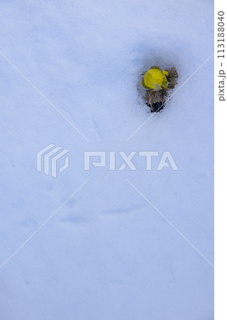 雪の中の福寿草のアップ