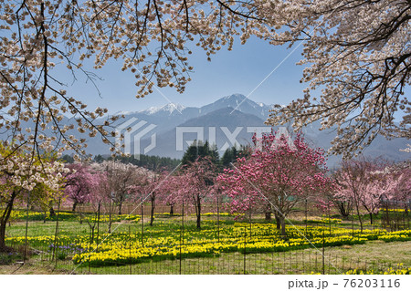 眞原桜並木の満開の桜とスイセン、雪被る南アルプス鳳凰三山
