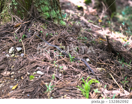 京都大原山中の針葉樹の落ち葉の中を進むヤマカガシ