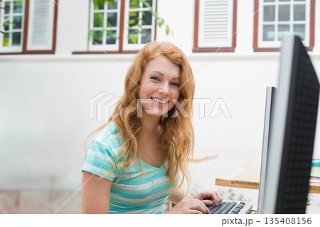 Red-haired woman sitting at home office desk typing on keyboard near shuttered window with books