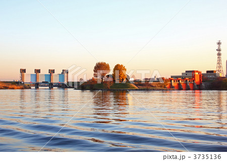 夕暮れの夏空と赤い水門 東京都赤羽の赤水門