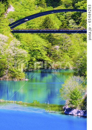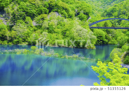 新緑に囲まれた奥四万湖の青い湖面と赤沢橋