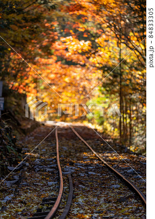 長野県上松町 紅葉に包まれた赤沢自然休養林内の渓流とオープントロッコ列車の橋
